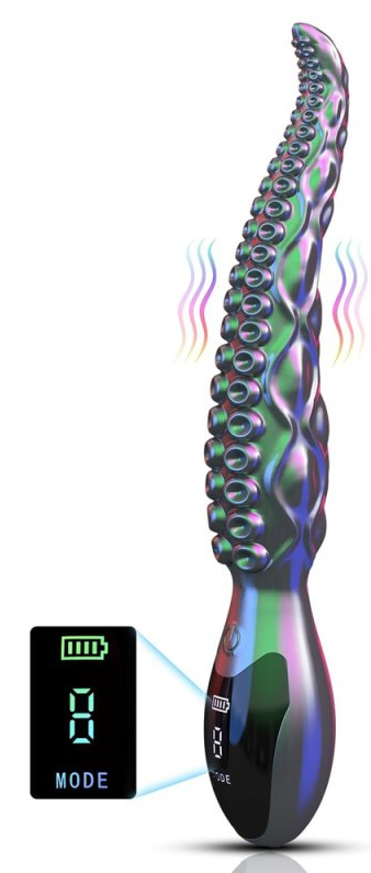 Gode vibrant, aux multiples reliefs. 9 modes de vibrations et afficheur.Longueur insérable de 19 cm et largeur de 2 à 3.6 cm.En silicone.