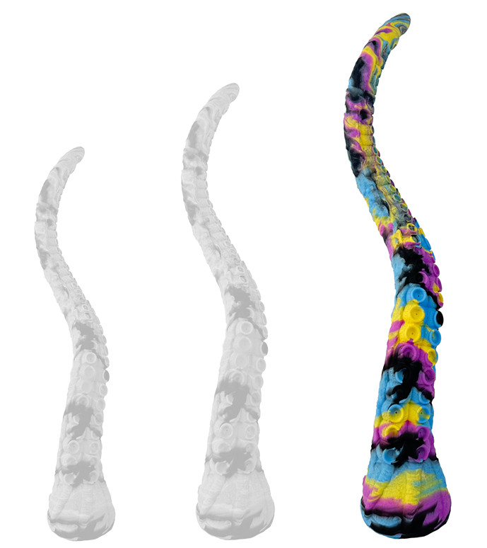 Longueur insérable de 50 cm et largeur allant de 1.2 à 5.5 cm.Avec une surface comportant des sortes de ventouses comme sur un tentacule.En silicone.