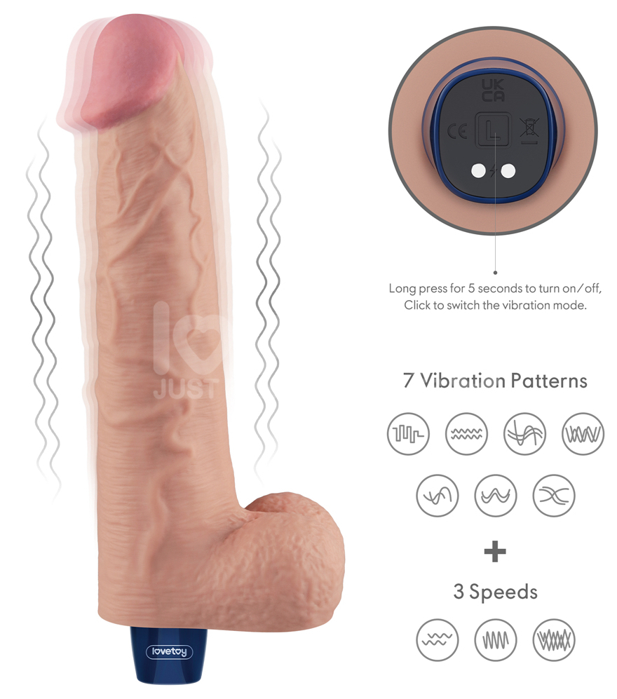 Caractéristiques : Longueur totale 27 cm Longueur insérable 21 cm Largeur 3.8 à 5.3 cm Rechargeable — batterie lithium 10 modes de vibrations Câble USB magnétique Conseils d'utilisation : Nettoyer avant et après chaque utilisation avec de l'eau tiède savonneuse et le laisser sécher à l'air libre Utiliser uniquement du lubrifiant à base d'eau Conserver dans un endroit propre et sec, à l'abri de la lumière et de la chaleur, sans contact avec d'autres objets.