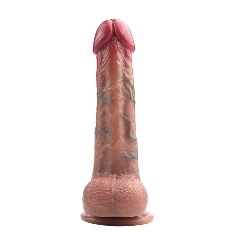 Gode vibrant d'une longueur insérable de 14 cm pour une largeur de 3 à 4 cm. Gland décalotté, surface veinée et bourses rondes. 10 modes de vibrations. En silicone marron, avec base ventouse.