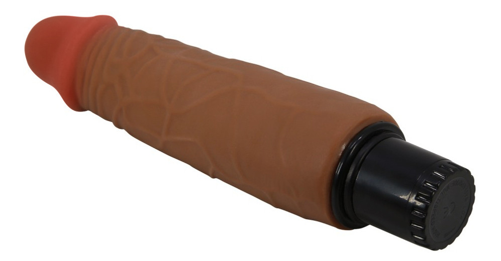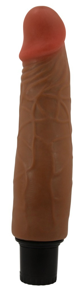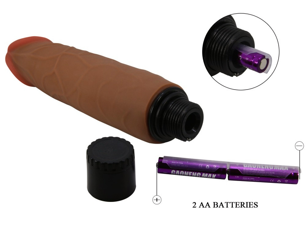 Gode vibrant avec gland décalotté et surface texturée.Longueur insérable de 17.5 cm et largeur de 3.8 à 4.2 cm.En TPR, avec variateur fonctionnant à piles (2 AA non fournies).