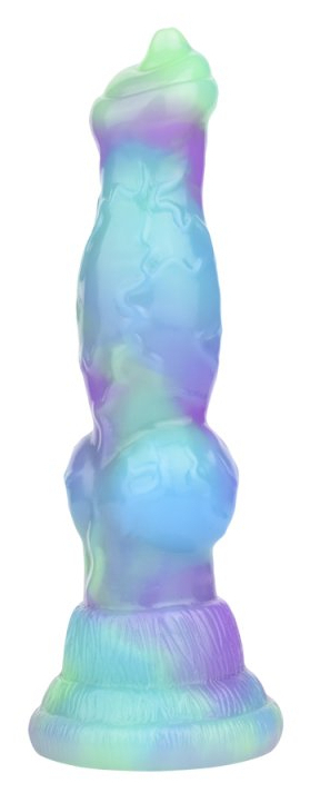 Gode vert et violet avec une forme de sexe de chien.Longueur insérable de 16 cm. Largeur maximale de 4.5 cm.Avec une base ventouse. En Silicone.