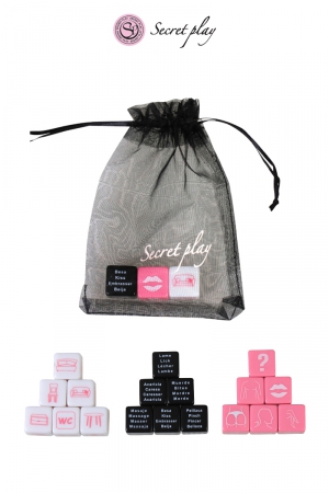 La marque espagnole Secret Play à eu la bonne idée de vous proposer un jeu qui se chargera de vous donner des ordres. Pour jouer, il suffit de faire un lancer et de lire les 3 faces visibles sur les dés. Commencez par le rose qui vous indique une partie du corps, puis le noir qui vous dit quoi faire et finissez par le blanc qui vous indique un lieu.