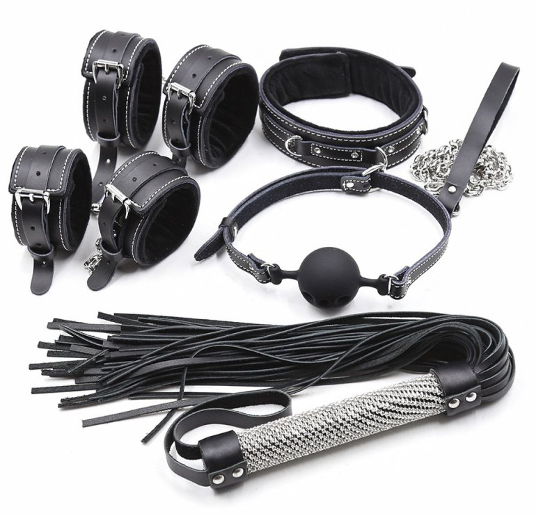 Kit avec un martinet, un bâillon-boule, un collier-laisse, des menottes de chevilles et des menottes de poignets.Matière simili et intérieur rembourré en fourrure.Avec petits strass brillant à la surface.