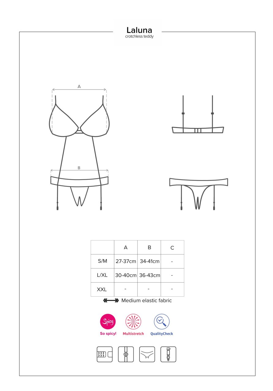 Comment passer d?une soir�e romantique � une folle nuit d?amour ? Portez le body LALUNA qui allie la d�licatesse de la dentelle � la coupe hyper sexy du body. D�tail irr�sistible, le galbe des fesses est ourl� de dentelle et mis en valeur par des d�coupes coquines !N?oubliez pas de commander les bas assortis LALUNA pour parfaire votre look de femme fatale.Tissu doux scintillantDentelle noire stylis�eBretelles, jarretelles et fermeture dos r�glables, ajustement parfaitEntrejambe ouvertBretelles reliant le soutien gogre � la culotte d�tachablesD�tails sexy, noeud et bijouxTissu multistretchComposition : 90% polyamide, 10% �lasthanne