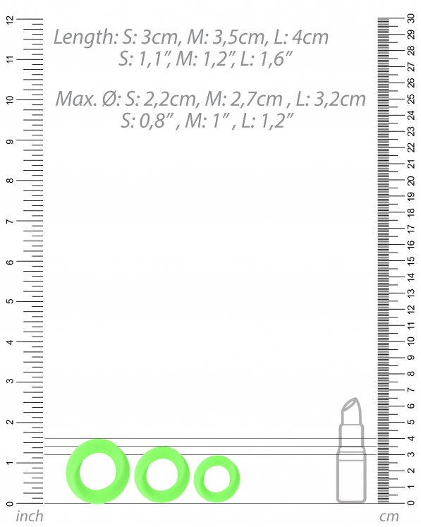 Ce lot de 3 cockrings phosphorescents est idéal pour serrer la base du pénis et les testicules. Les diamètres intérieurs sont de 20mm, 25mm et 30mm.les épaisseurs sont fines. En silicone souple