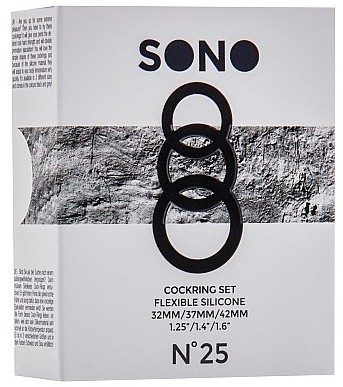 Ce lot de cockrings gris est fabriqué par la marque SONO. Il correspond au sextoy n°25 et présente 3 anneaux péniens pour renforcer l'érection. Diamètres de 22, 25 et 32mm avec des dimensions extérieures de 32, 35 et 42mm. Ils sont fabriqués en matière si