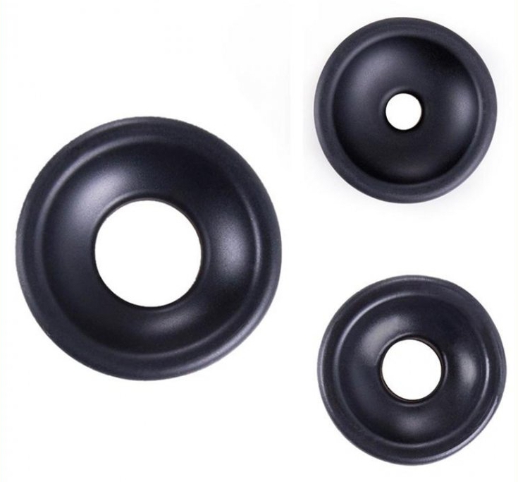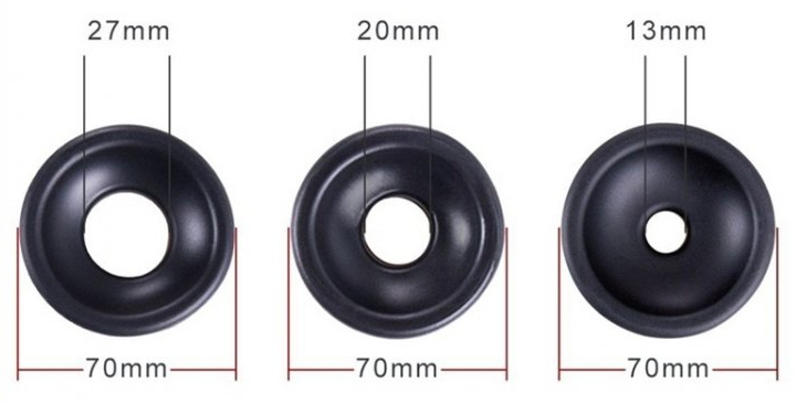 Voilà 3 manchons souples pour placer à l'extrémité des cylindres de pompes de pénis.Avec un diamètre de 60mm, il s'adaptent à quasiment tous les cylindres. Ouverture avec des diamètres de 13mm, 20mm et 27m pour varier l'intensité du serrage sur le pénis.