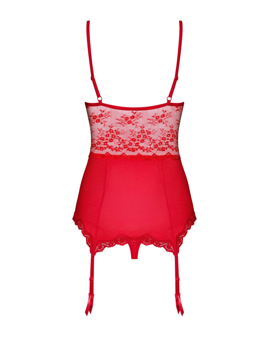 Parfaite pour une nuit de sensualit�, vous allez vous transformer en reine d'amour dans cette gu�pi�re sexy rouge qui poss�de des armatures de poitrine pour un d�collet� renversant. Bretelles et jarretelles r�glables et bien entendu un string assorti fourni. Cette gu�pi�re sexy est d�cor�e de petites perles (imitation) et est fait de dentelle soyeuse, mat et brillante, sa composition est de 95% Polyamide 5% ElasthanneD�couvrir toute la collection de lingerie sexy Lovica Obsessive