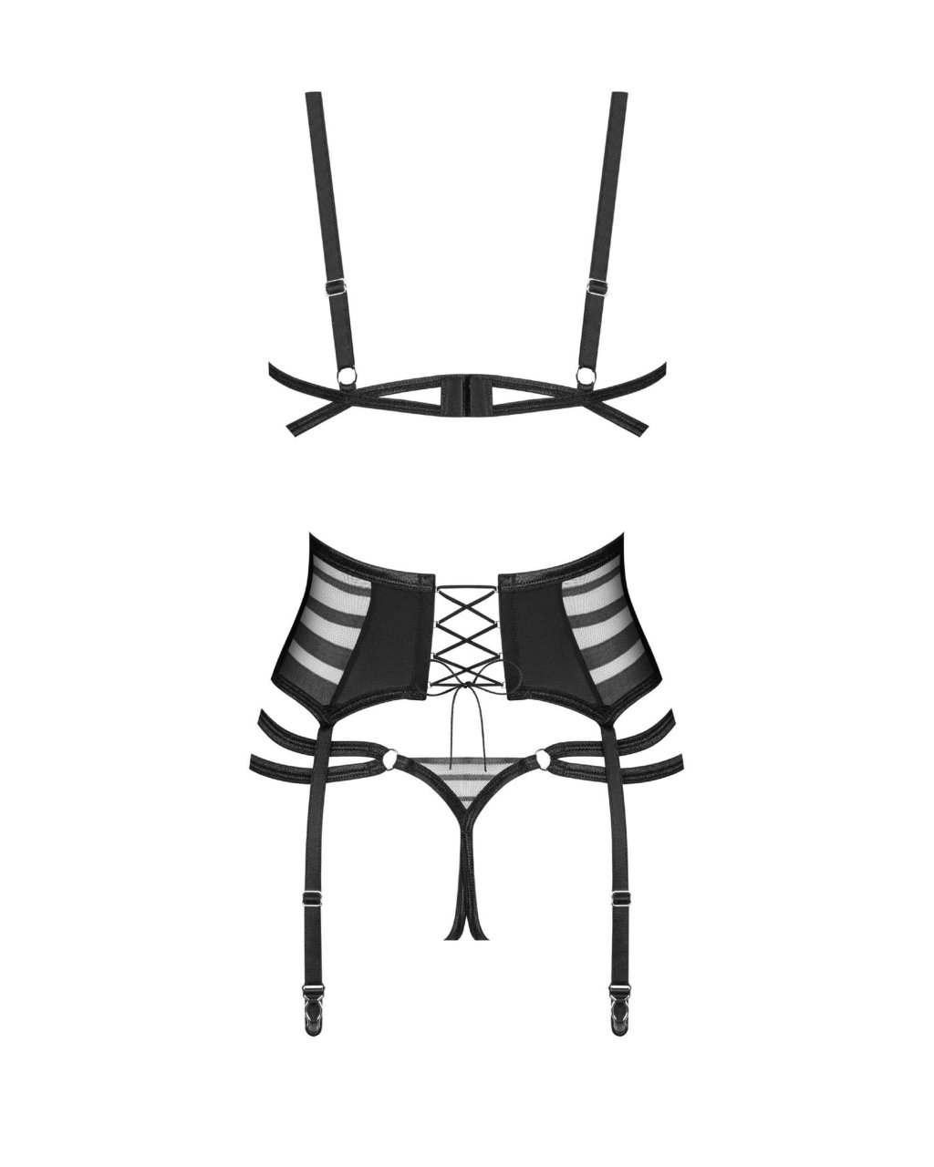 Lune Bellis ensemble ouvert 3 pi�ces� �Une �l�gance provocante avec un soup�on de gaiet�. Voici le set de lingerie ouverte 3 pi�ces Lune Bellis, avec des rayures transparentes pour une allure captivante. Fabriqu� � partir de tissus de qualit� sup�rieure, y compris le tissu tiss� lisse et maille �lastique,Il comprend�: un soutien-gorge avec des bonnets ovales pour une coupe flatteuse, un porte-jarretelles large avec bretelles int�gr�es et un string ouvert pour une finition audacieuse. ? soutien-gorge, string et porte-jarretelles noirs? tissu doux au toucher et maille transparente? Bonnets � armatures et courroie de soutien? Ajustements pour un confort ultime? fermeture � lacets � l?arri�re? 90�% polyamide, 10�% �lasthanne? con�u dans l?UE? sans nickel