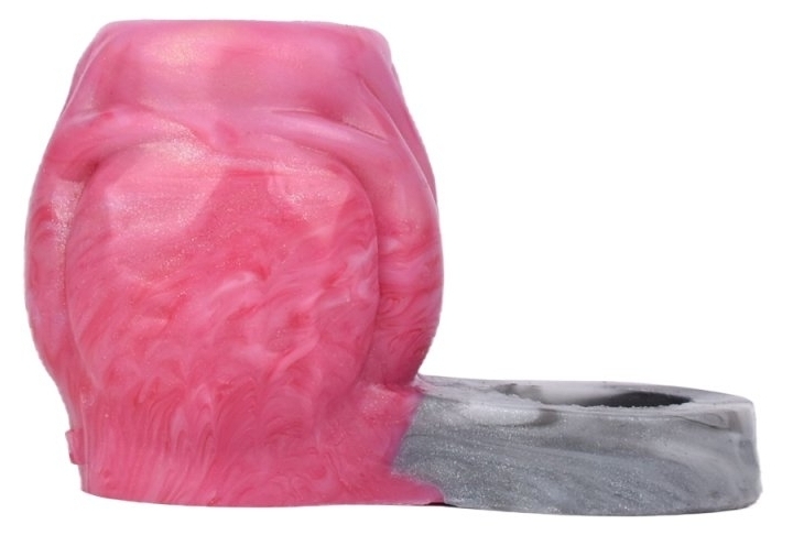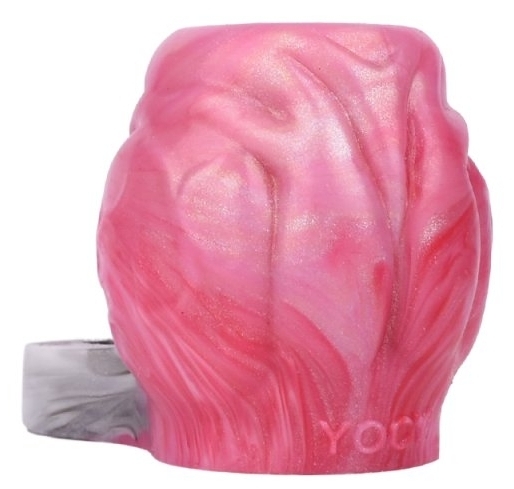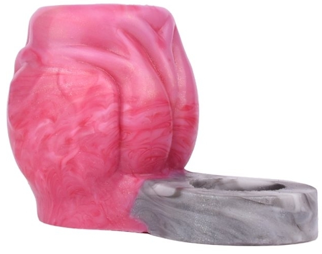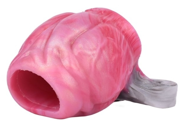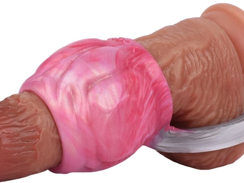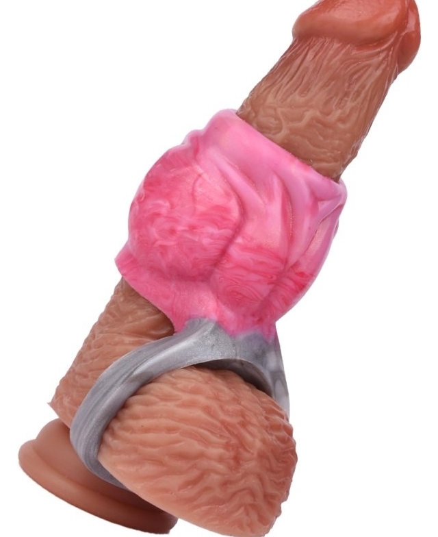 Manchon de pénis avec une forme originaleet couleur rose.Largeur de 6.5 cm. La longueur est de 7.5 cm. Le diamètre intérieur est de 35 mm étirable.Fixation au-dessus des bourses avec l'anneau de 25 mm. En silicone