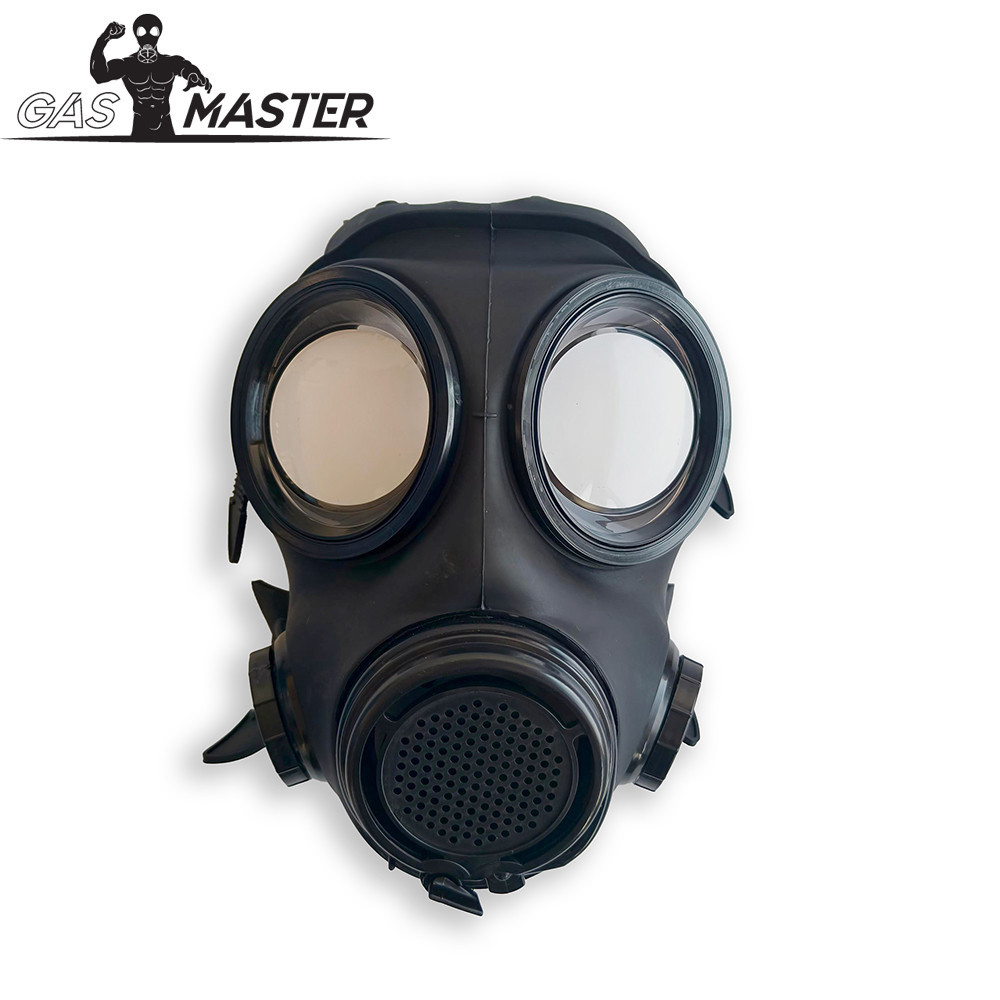Masque en caoutchouc avec globes oculaires transparents pour voir à travers.Avec entrées d'air latérales (filetage 40 mm femelle).Bandes caoutchouc pour le maintien derrière la tête.