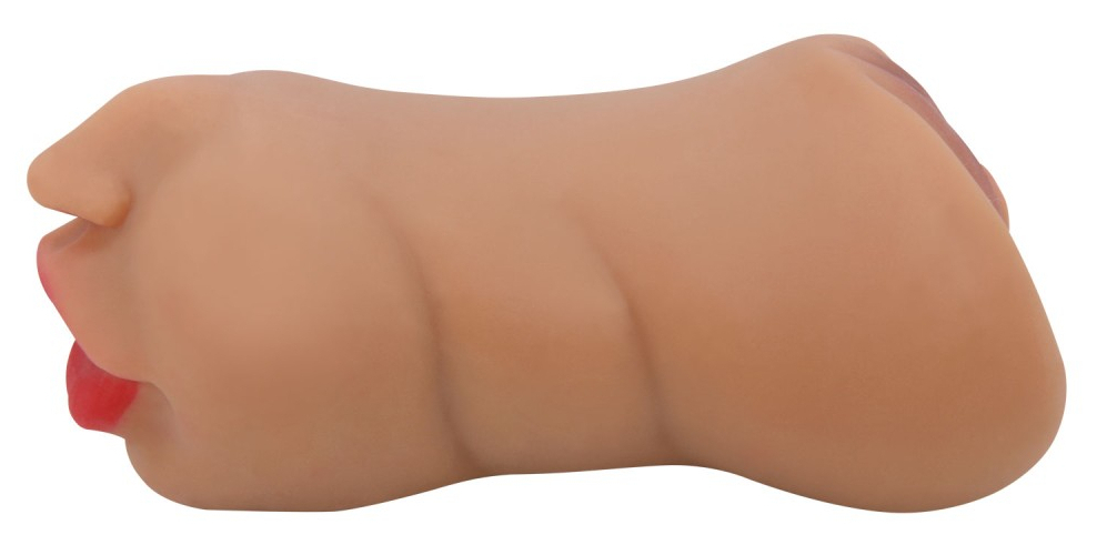 Masturbateur avec double entrée, vulve et bouche, aux reliefs variés. Longueur insérable de 14.5 cm En TPR de couleur marron.