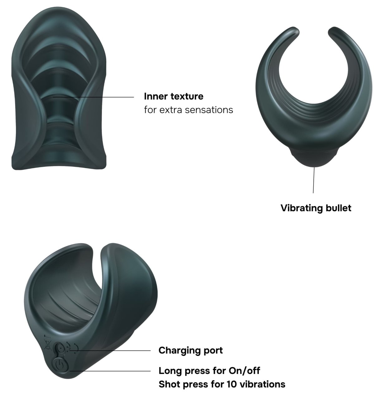 Masturbateur avec 10 modes de vibrations.Diamètre intérieur de 35 mm avec les parties latérales souples.Longueur de 7.5 cm. En silicone.Recharge USB