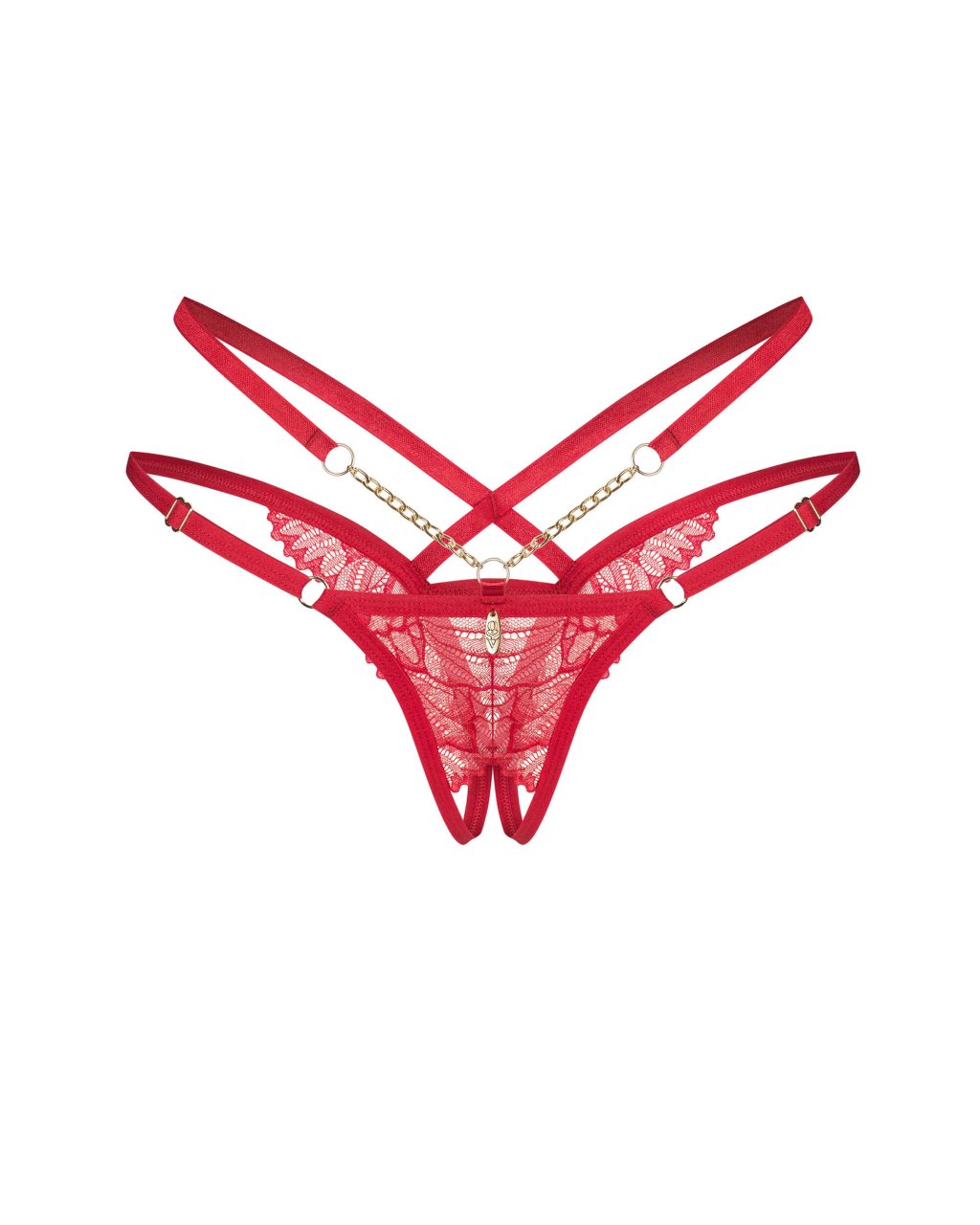 Matildea string ouvertString rouge ouvert en dentelle d�licate avec un motif complexe. Dot� de doubles bretelles lat�rales et de d�coupes s�duisantes. Le devant est orn� de cha�nes dor�es, de connecteurs ronds et d?un petit pendentif. Le c�t� arri�re pr�sente un magnifique design � lani�res, tandis que l?entrejambe ouvert ajoute une touche audacieuse.- ouvrir l?entrejambe pour des exp�riences �pic�es- dentelle avec un motif unique- doubles sangles de hanches (les plus basses sont r�glables)- �l�ments d�coratifs �l�gants dor�s (sans nickel)- composition : 90% polyamide, 10% �lasthanneCe produit ne convient pas aux enfants de moins de 3 ans ? risque d?�touffement en raison des petites pi�ces qui peuvent �tre d�tach�es du produit.