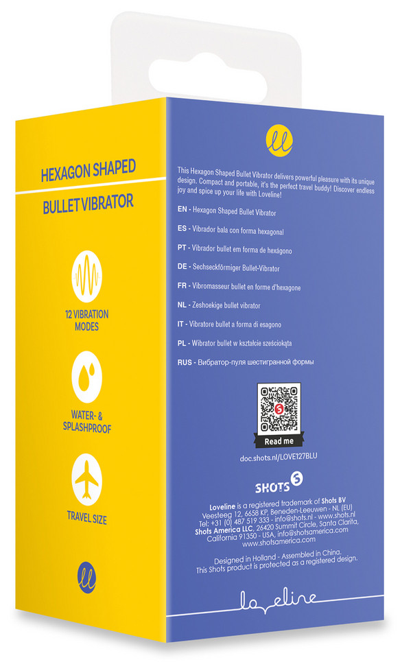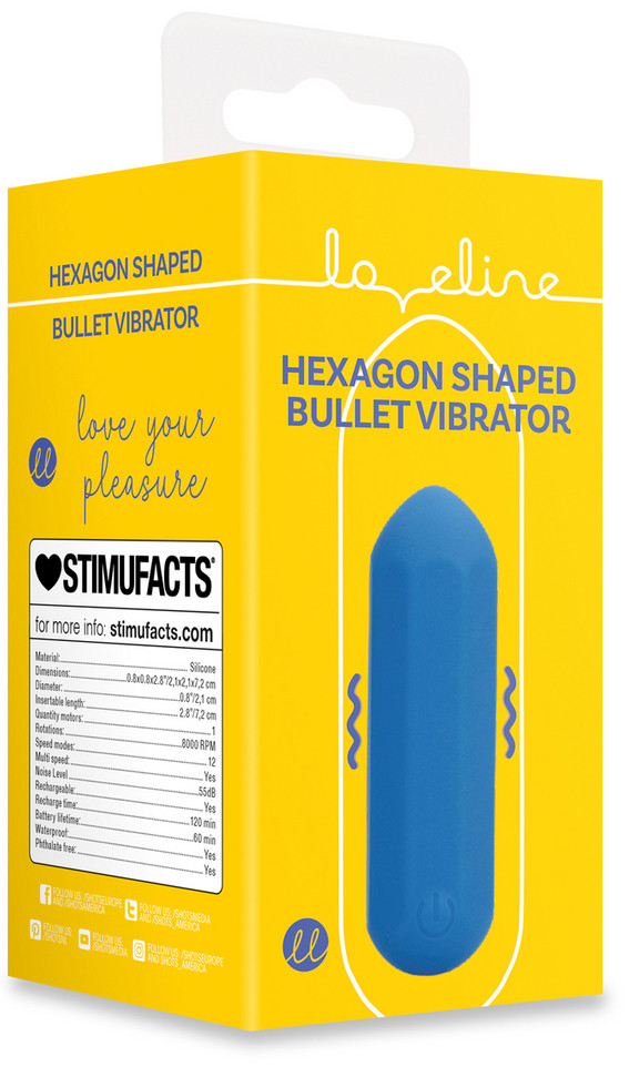 Mini-vibro de forme hexagonale avec 12 modes de vibrations.Longueur insérable de 6 cm et largeur de 2.3 cm.En silicone étanche et rechargeable.