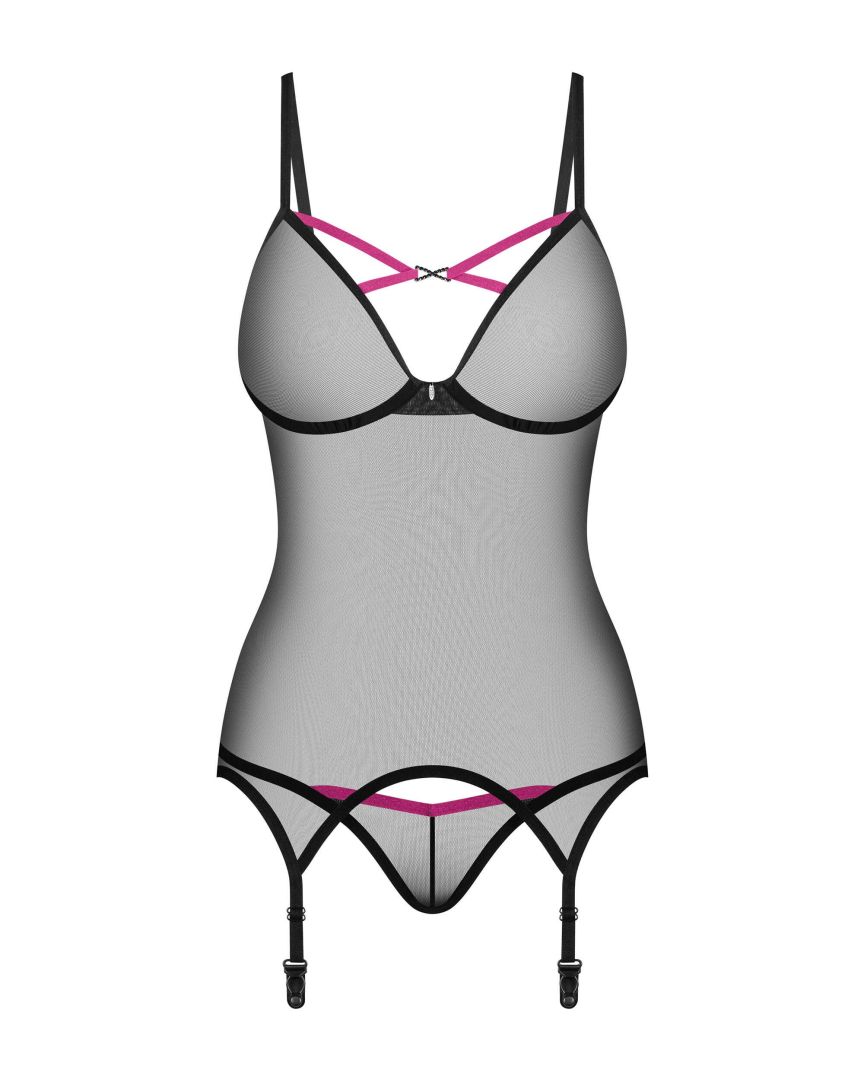 Novenes corset et stringSublimez vos moments intimes avec cet ensemble de bon go�t, un compl�ment parfait � un rendez-vous romantique. Le corset et le string, fabriqu�s � partir de tissu subtilement transparent, pr�sentent un design moderne soulign� par des accents roses et des jarreti�res non d�tachables. ��� ?� corset et string noirs��� ?� tissu transparent��� ?� bonnets � armatures��� ?� sangles �lastiques de couleur pourpre��� ?� r�glable �paule et non amovible������� jarretelles��� ?� d�coration �l�gante et brillante avec du noir ������� zircons��� ?� 94�% polyamide, 6�% �lasthanne��� ?� con�u dans l?UE��� ? ne contient pas de nickel