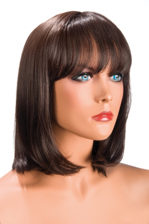 Perruque châtain à la coupe moderne. Camila est mi-longue et sa frange effilée retombe presque sur les yeux. Sa mèche effilée tombant au dessus des yeux les mets parfaitement en valeur.