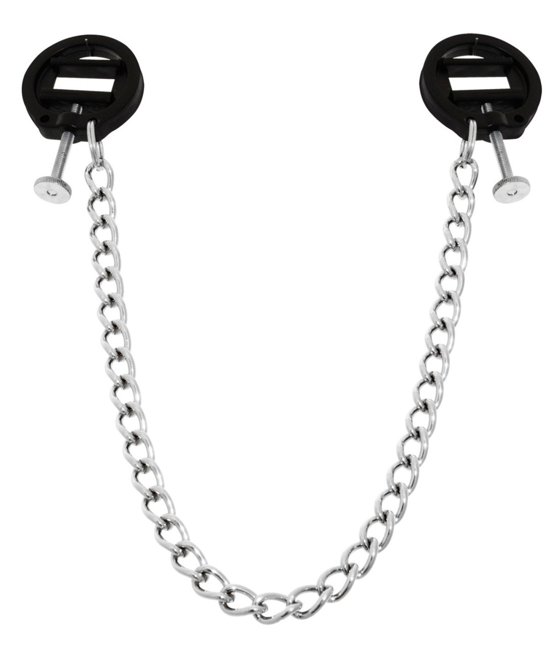 Ces pinces pour les tétons de la marque Kiotos sont assorties d'une chaîne en métal.Elles permettent de pincer les tétons et d'augmenter les sensations lors des jeux coquins. Les pinces sont rondes avec un diamètre de 4cm. L'ouverture maximale est de 1cm
