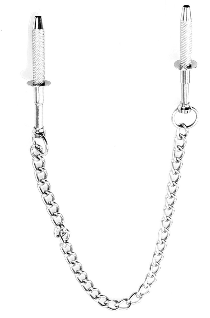 Ces pinces pour les tétons sont composées de crochets venant accrocher les tétons et donner des sensations intenses.Chacune des pinces mesure 7cm de long. La chaîne mesure 30cm. Fabriquées en acier inox