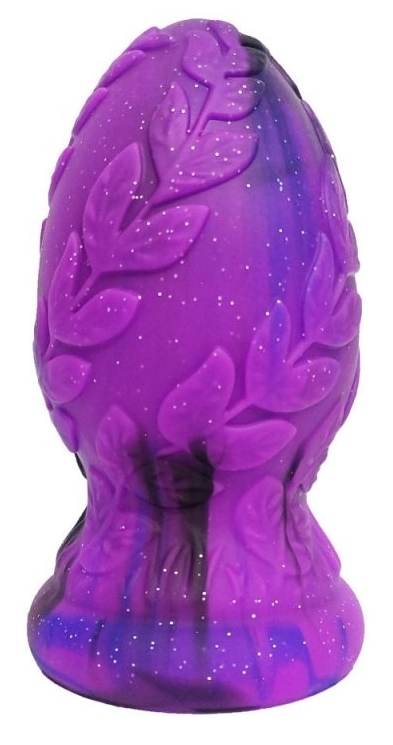 Plug en silicone violet et bleu en forme d'oeuf Relief en forme de feuilles d'olivier Sa longueur est de 8 cm et sa largeur maximale de 4.7 cm Base ventouse Plug en silicone souple