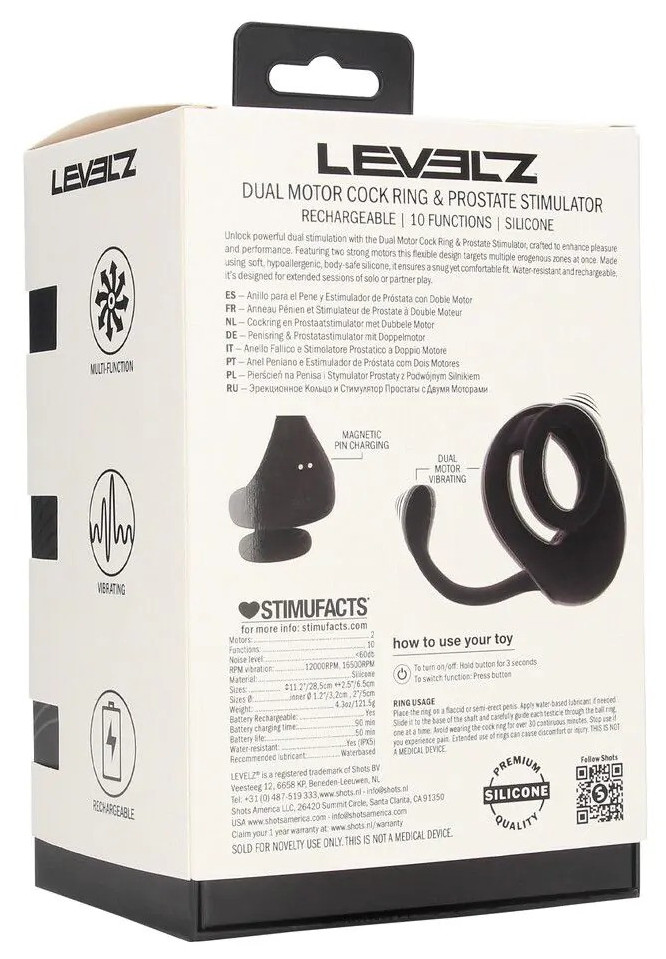Avec 10 modes de vibrations qui se diffusent depuis 2 moteurs : à l'extrémité et sur les anneaux.En silicone.Recharge USB.