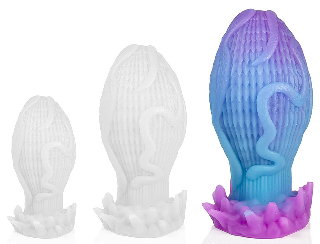 Plug oeuf, avec relief texturé.Longueur insérable de 15 cm et largeur de 4.5 à 8.5 cm.En silicone.