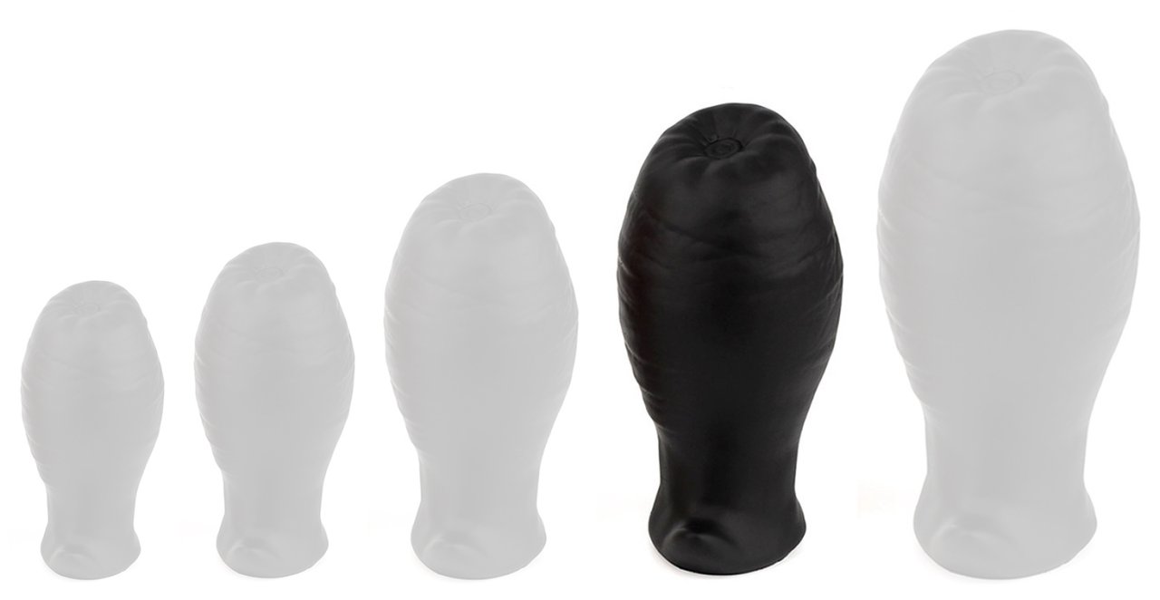 Plug en forme d'oeuf, avec base et extrémité plates. Longueur insérable de 10.5 cm et largeur de 3.8 à 6.3 cm. En silicone.