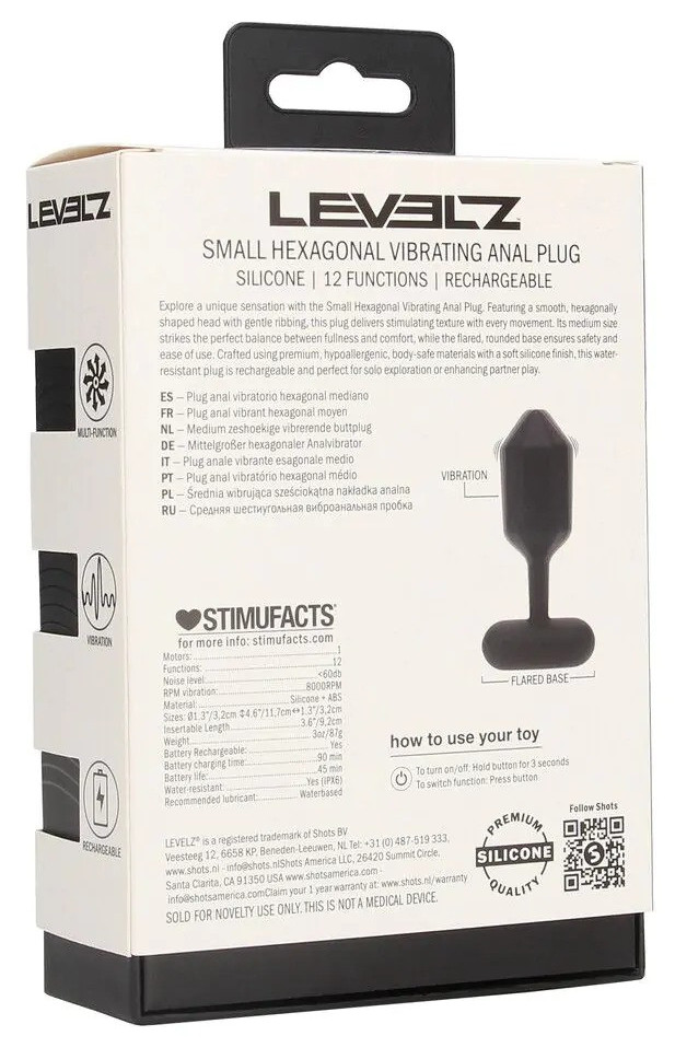 Longueur insérable de 9.5 cm et largeur maximale de 3.5 cm.Forme originale avec 6 faces.Avec 12 modes de vibrations.En silicone.