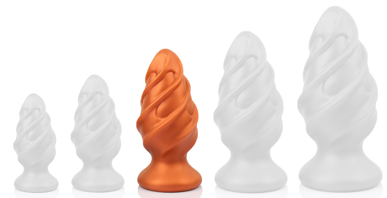 Plug, à la surface texturée. Longueur insérable de 12 cm et largeur de 3.5 à 6 cm.En silicone, avec base ventouse