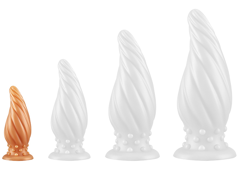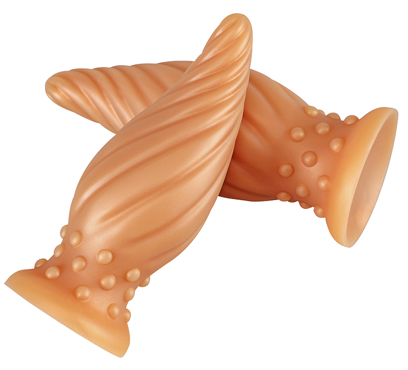 Plug anal, en forme de goutte, avec une base ventouse. Longueur insérable de 12.5 cm et largeur de 2.5 à 5.2 cm En silicone couleur or.