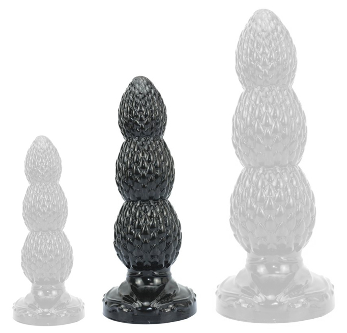 Plug avec une forme en 3 paliers permettant une insertion progressive.Avec la surface texturée.Longueur insérable de 19 cm. Largeurs de 4.2, 5.2 et 6 cm. Avec la base ventouse. En PVC.