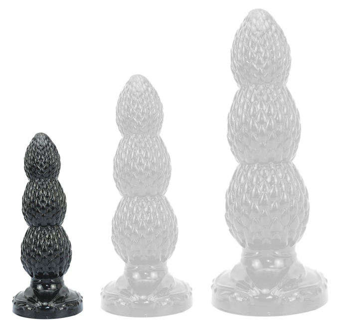 Plug avec une forme composée de 3 paliers et une surface texturée.Longueur insérable de 14 cm. Largeurs successives de 3.2 cm, 4 cm et 4.5 cm.Avec une base ventouse. En PVC.