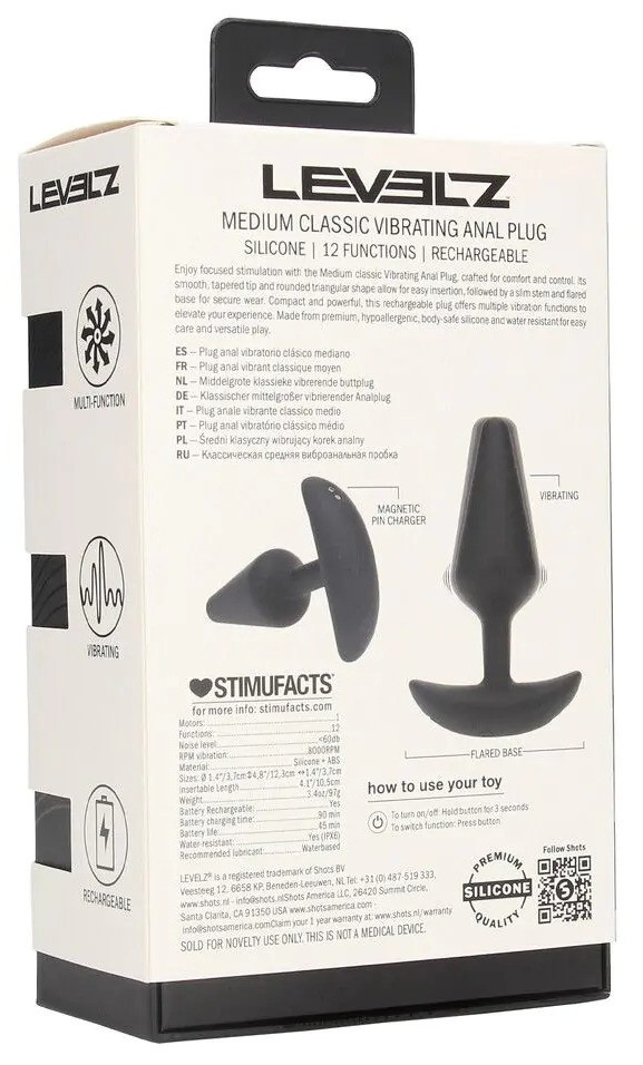 Accessoire avec une forme classique de plug et une longueur insérable de 10.5 cm. Largeur maximale de 3.7 cm.Avec 12 modes de vibrations.En silicone.