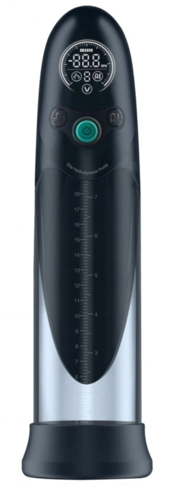 Pompe avec un cylindre gradué de 20 x 6.3 cm légèrement bleuté.Avec des modes de succion automatiques pour faire gonfler le pénis.Avec l'écran Lcd.Utilisation possible avec de l'eau. 100% Étanche.Recharge en USB.
