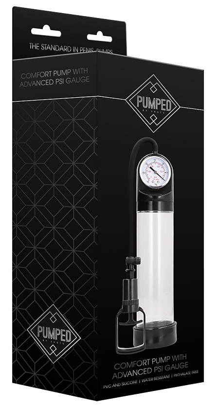 Cette pompe à pénis avec jauge de la marque Pumped est ici dans sa version Comfort Pump. Elle se compose d'un cylindre transparent et gradué de 21cm de longueur et de 6cm de largeur.La jauge permet de voir la pression à l'intérieur. La poignée donne une b