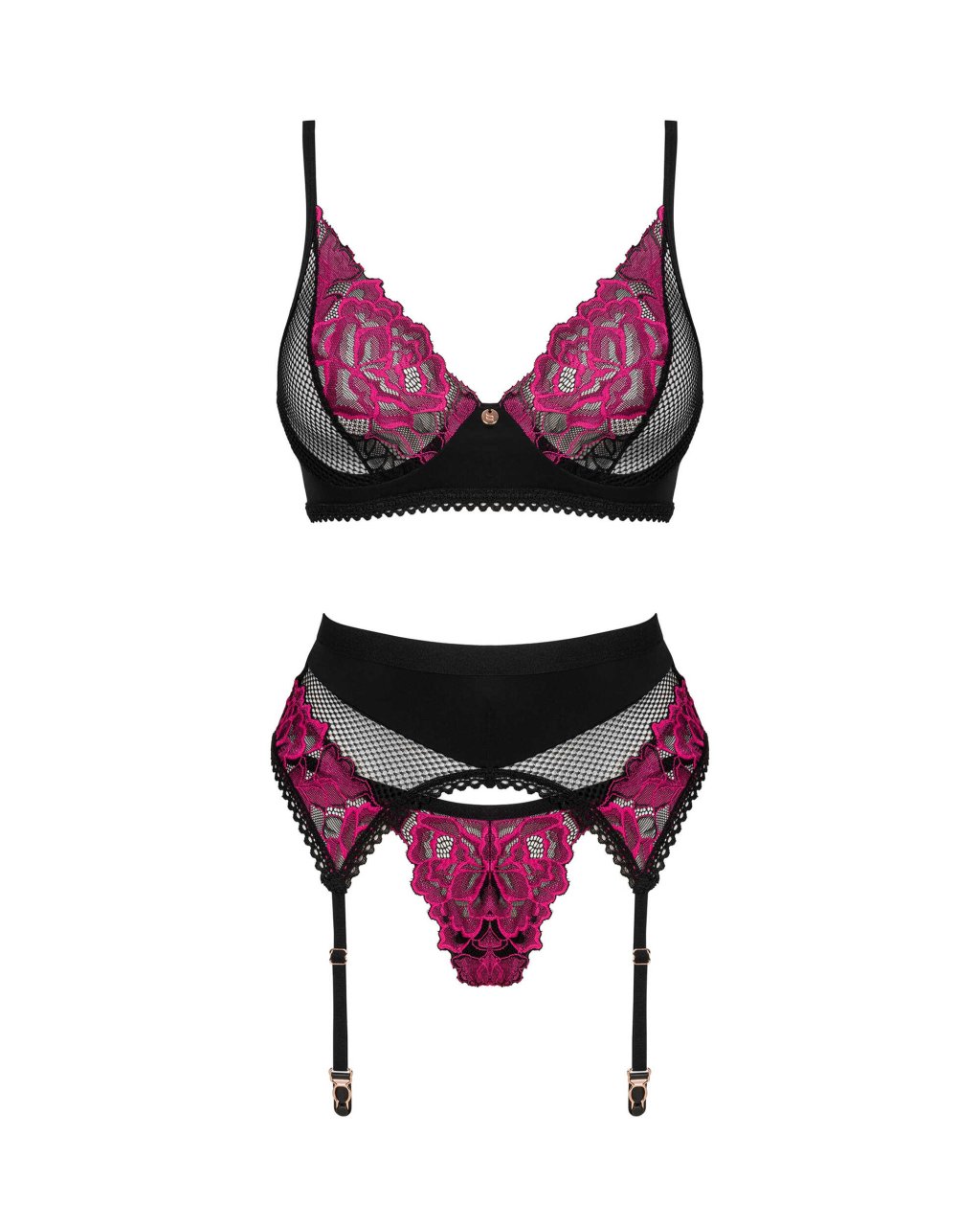 Ensemble 3 pi�ces RosentyC�l�brez le temps pass� ensemble ou offrez-vous un cadeau de r�ve en choisissant un magnifique ensemble Rosenty ! Sentez vos sens s'affoler lorsque vous enfilez ce magnifique string, soutien-gorge et porte-jarretelles assorti, d�cor� de ce motif floral unique. Laissez-vous tenter par une pinc�e de folie et vous ne le regretterez pas !D�couvrez plus de d�tails :- un ensemble de lingerie compos� d'un soutien-gorge, d'un string et d'un porte-jarretelles- un ajustement parfait gr�ce � la fermeture en plusieurs �tapes et aux bretelles r�glables- des bonnets � armatures - une mise en valeur parfaite de la poitrine- un pendentif brillant - un compl�ment charmant- une maille sensuelle avec un motif floral- tissus non conventionnels Composition : 90% polyamide, 10% �lasthanne