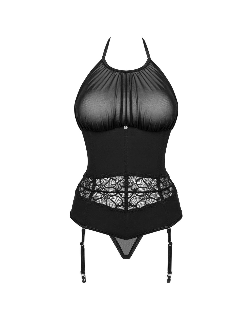 Vous r�vez d'une lingerie qui vous fasse sentir sulfureuse, s�duisante et confortable � la fois ? Le corset Serafia mettra en valeur vos courbes sexy ! La combinaison unique de mati�res vous rendra hypnotisante et la sangle de cou assurera votre confort. Plongez dans le plaisir !D�couvrez plus de d�tails :- string et corset en noir- un ajustement parfait gr�ce � la fermeture en plusieurs �tapes et aux bretelles et porte-jarretelles r�glables- accentuation des courbes f�minines assur�e par des armatures verticales et un tour de cou - porte-jarretelles amovibles- pendentif brillant - un accessoire minimaliste- une combinaison int�ressante de tissus agr�ables au toucher 94 % de polyamide, 6 % d'�lasthanne
