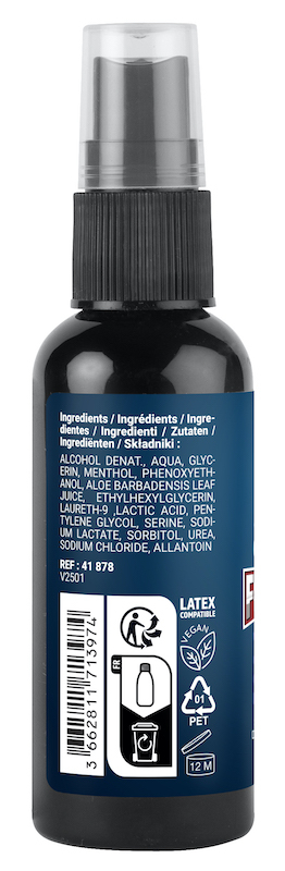 Composition : Alcohol Denat, Aqua, Glycein, Menthol, Phenoxyethanol, Aloe Barbadensis Leaf Juice, Ethylhexylglycerin, Laureth-9, Lactic Acid, Pentylene Glycol, Serine, Sodium Lactate, Sorbitol, Urea, Sodium Chloride, AllantoinPrécautions d'utilisation :Conserver dans un endroit sec et à l'abri de la lumièreGarder hors de portée des enfantsÉviter le contact avec les yeux, la peau abimée et les plaies.En cas d'irritations, arrêter l'usage et de consulter un médecin si cela persisteTester sur une petite surface. En cas de rougeurs, allergies ou gênes, ne pas utiliserCe lubrifiant n'est pas un contraceptif. Il ne contient pas de spermicideNe pas avaler