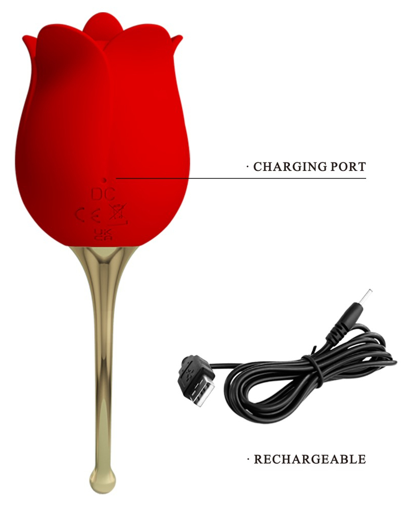Caractéristiques :Longueur totale 14 cmLargeur de la rose 5 cmRechargeable – batterie lithium12 modes de vibrations et 12 modes de léchageÉtanche, sans immersionAutonomie 90 minTemps de charge 60 minConseils d'utilisation :Le nettoyer avant et aprèsUtiliser un lubrifiant à base d'eau Le conserver dans un endroit propre, sec et à l'abri de la chaleur.