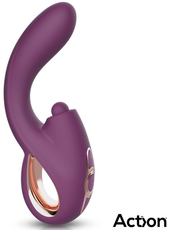 Stimulateur de clitoris avec 10 modes de vibrations, 3 modes de tapotements et 7 modes de poussées. Forme courbée pour toucher le point G. Boule pour le tapotement au niveau du clitoris. 3 moteurs indépendants. Partie insérable pour le point G de 11 cm