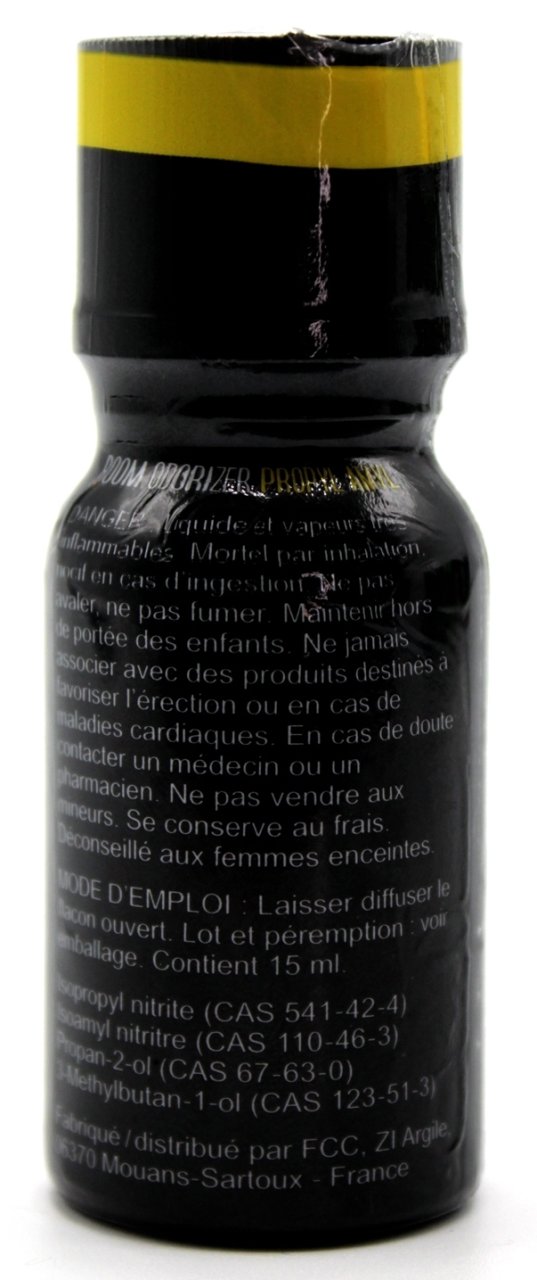 Précautions d'utilisation: Produit inflammable - ne pas mettre en contact avec une source de chaleur Ne pas ingérer Éviter le contact avec la peau, les yeux et les muqueuses En cas de problèmes, contacter un médecin ou appeler le centre anti-poison le plus proche Tenir hors de portée des mineurs Conserver dans un endroit frais et ventilé Ne pas utiliser avec des stimulants érectiles ni en cas de problèmes cardiaques, vasculaires ou d'insuffisance respiratoire Composition : Isopropyl Nitrite (CAS 541-42-4), Isoamyl Nitrite (CAS 110-46-3), Propan-2-ol (CAS 67-63-0), 3-Methylbutan-1-ol (CAS 123-51-3)