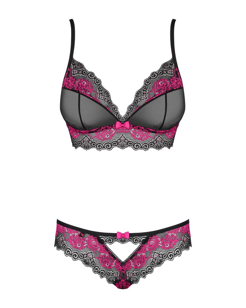 La lingerie sexy est une invitation � une soir�e tr�s chaude avec votre amoureux ... Portez cet ensemble d�s le matin, ce petit secret sexy sous vos v�tements vous mettra en condition pour vivre une incroyable nuit.D�couvrez tous les d�tails de cet ensemble :�Ensemble deux pi�ces en maille et dentelle�Bretelles r�glables et fermeture ajustable�Bonnets souples et partiellement transparents�Dentelle avec motif ��rose���Culotte en dentelle ComfyCut�D�coupe triangulaire originale et sexy�Orn� de deux petits noeuds roses�Tissus doux Multistretch - super �lastiqueComposition : 90% polyamide, 10% �lasthanne