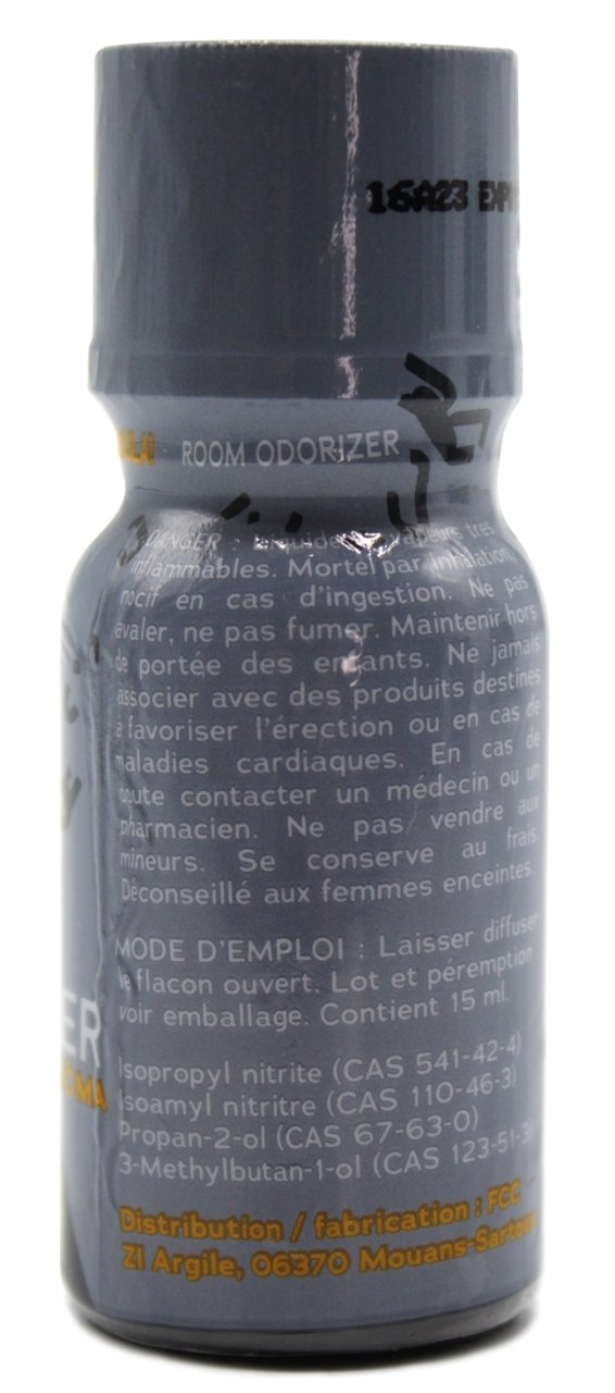 Précautions d'utilisation: Produit inflammable - ne pas mettre en contact avec une source de chaleur Ne pas ingérer Éviter le contact avec la peau, les yeux et les muqueuses En cas de problèmes, contacter un médecin ou appeler le centre anti-poison le plus proche Tenir hors de portée des mineurs Conserver dans un endroit frais et ventilé Ne pas utiliser avec des stimulants érectiles ni en cas de problèmes cardiaques, vasculaires ou d'insuffisance respiratoire Composition : Isopropyl Nitrite (CAS 541-42-4), Isoamyl Nitrite (CAS 110-46-3), Propan-2-ol (CAS 67-63-0), 3-Methylbutan-1-ol (CAS 123-51-3)