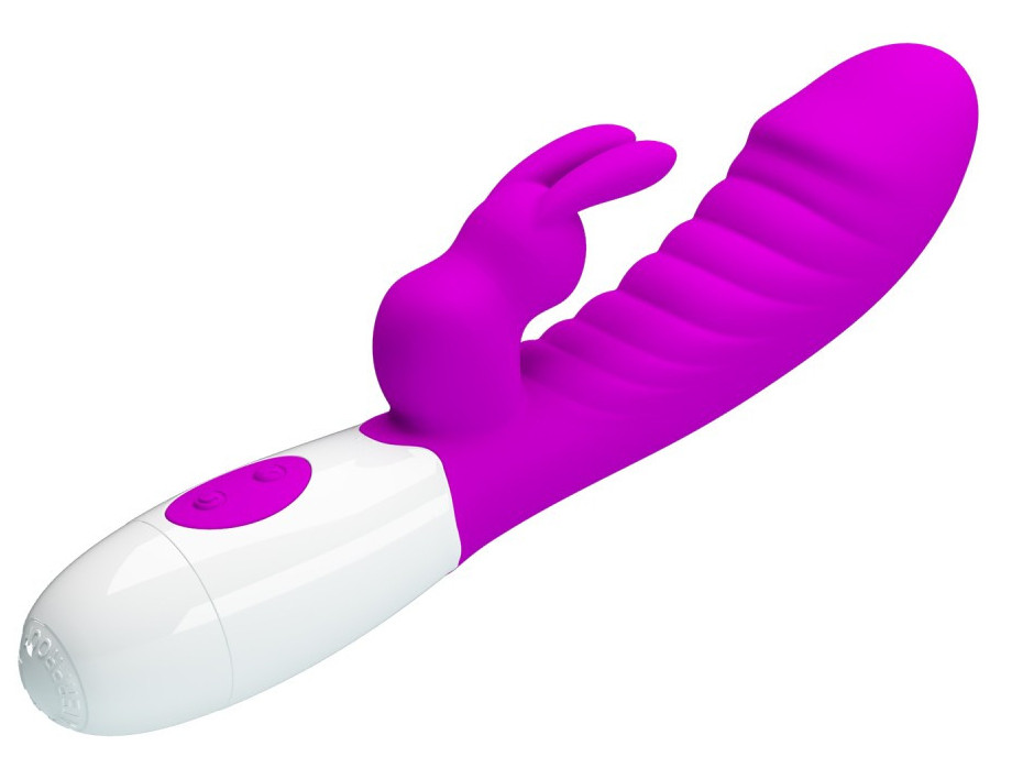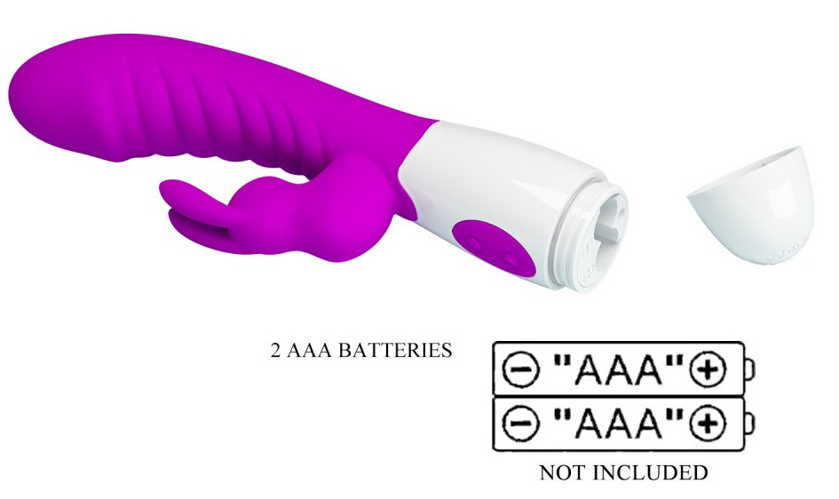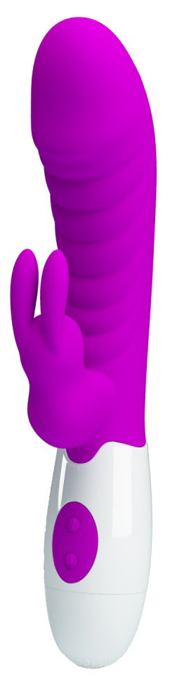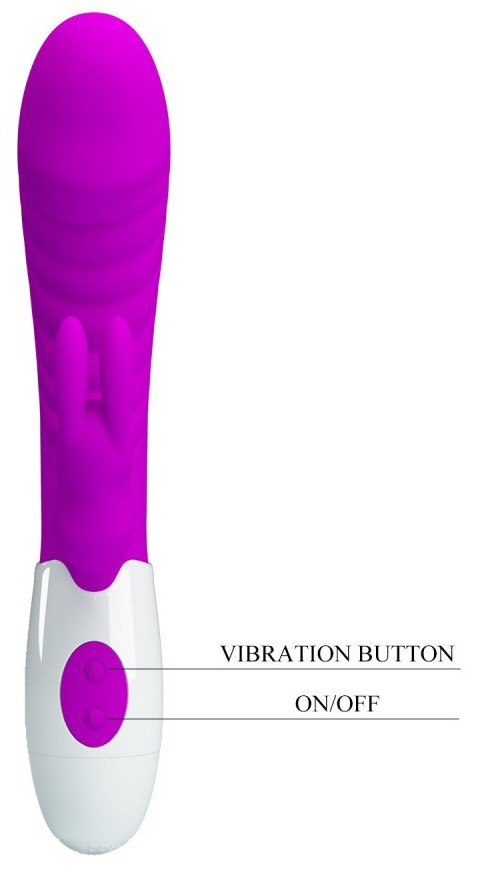 Rabbit avec 30 modes de vibrations. Longueur insérable de 10.5 cm et largeur de 2.5 à 3.7 cm. En silicone, fonctionne à piles.