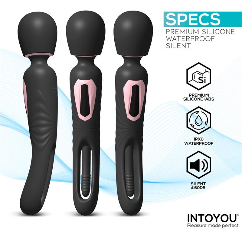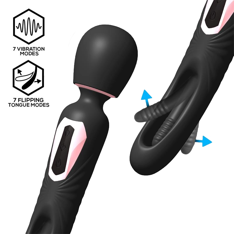 Wand de 47 mm de diamètre pour 5.5 cm de long, d'un côté et gode de 11 cm de long et 3.2 cm de large, de l'autre.7 vibrations et 7 mouvements de langue.En silicone.