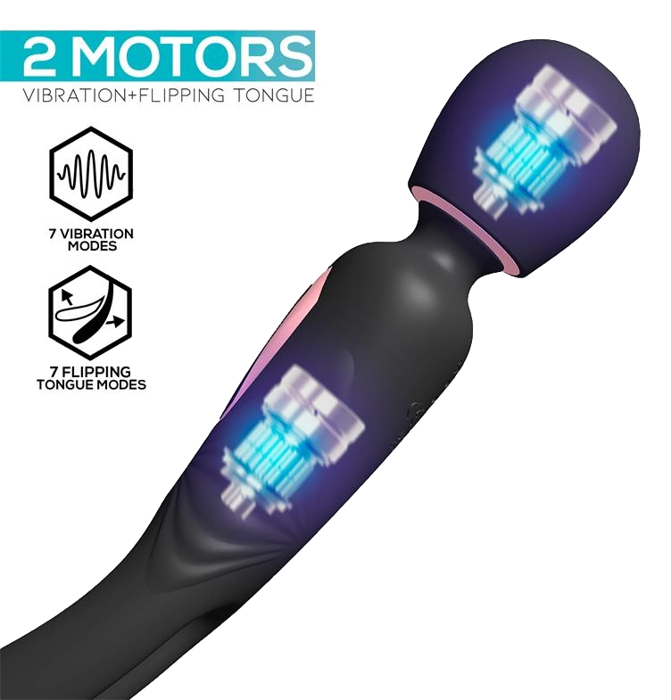 Caractéristiques :Partie gode : longueur insérable 11 cm, largeur de 2.9 à 3.2 cmPartie wand : longueur 5.5 cm, largeur 47 mmRechargeable – batterie lithium7 modes de vibrations7 mouvements de langue2 moteurs indépendantsÉtanche, pas d'immersionConseils d'utilisation :Le nettoyer avant et aprèsUtiliser exclusivement un lubrifiant à base d'eau Le conserver dans un endroit propre, sec et à l'abri de la chaleur.